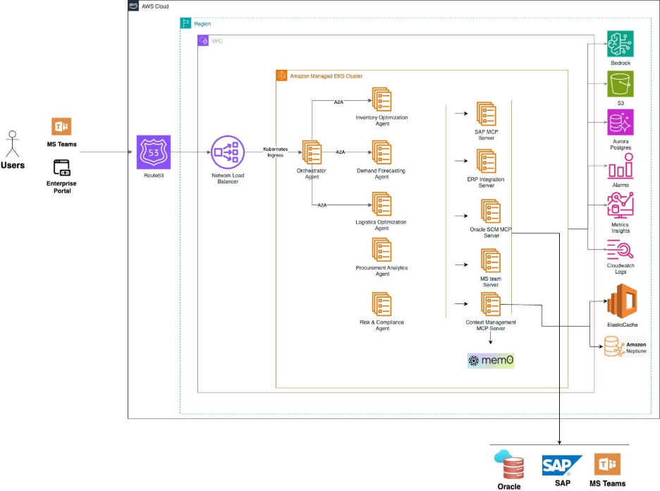 The enterprise implemented the Multi Agent Procurement Platform on AWS as an AI-native multi-agent platform for end-to-end supply chain optimization. The solution functions as a centralized AI orchestration layer deployed within an Amazon EKS cluster, where specialized agents handle domain-specific functions and communicate via Agent-to-Agent (A2A) protocol.