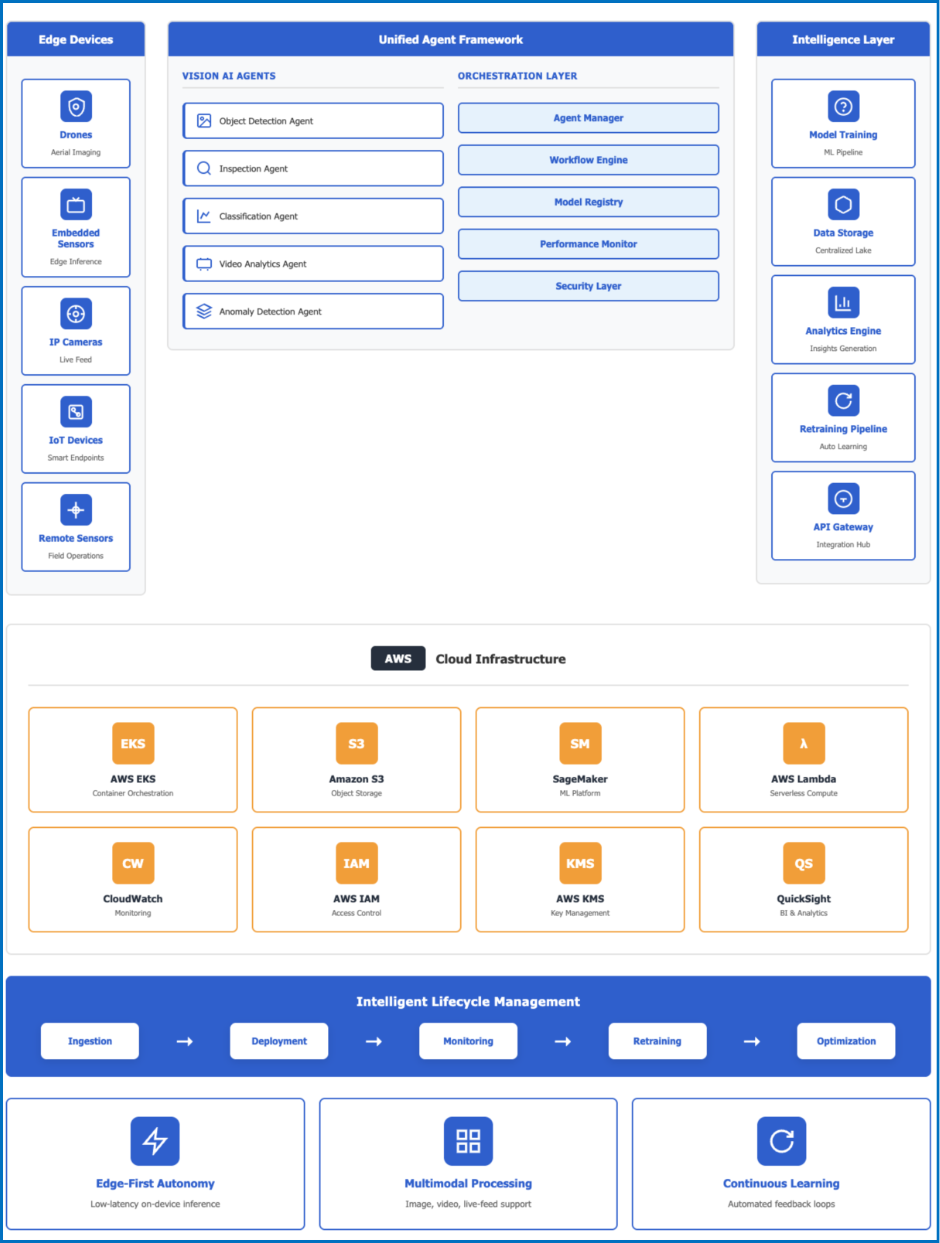 Deployment of SAIF Aviator core components (Unified Agent Framework, Multimodal Vision AI Engines). Integration with AWS EKS, S3, and SageMaker pipelines. |